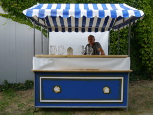 Dekorückwand sowie Ablagevorrichtung, 6 Maßkrüge und 1 große Stoppuhr.